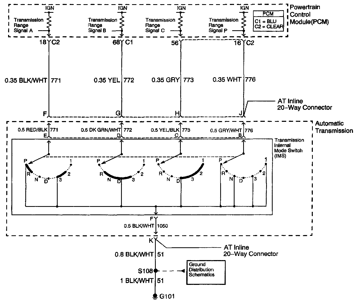 The transmission Internal Mode Switch (IMS) is a sliding contact switch attached to the selector detent inside the transmission side cover. The four inputs to the PCM indicate the position of the transmission range selector. The input voltage level at the PCM is high, B+, when the IMS is open and low when the switch is closed to ground. The four input parameters represented are Signals A, B, C and P - Parity.