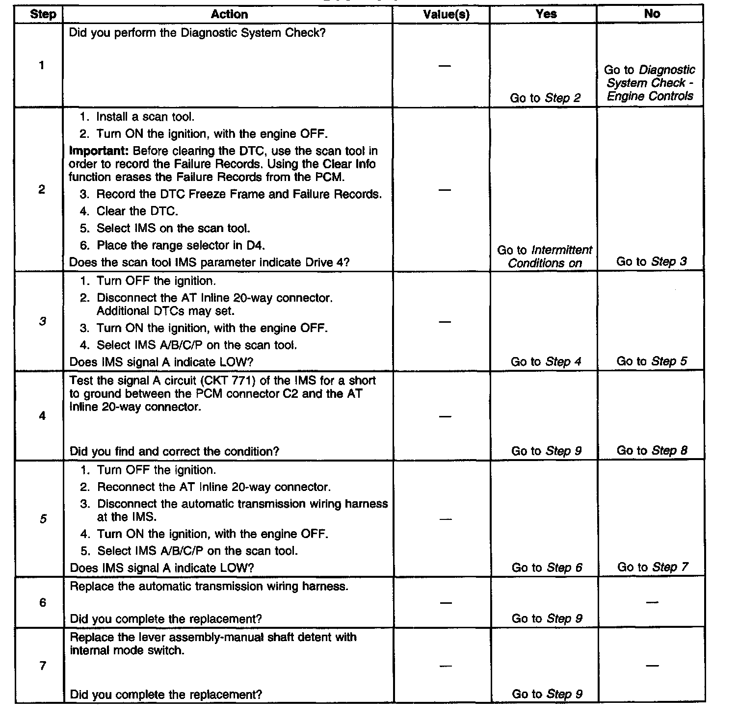 5. This step tests the internal transmission harness. A value of LOW for Signal A indicates the fault is in the harness. Otherwise the fault will be in the switch.