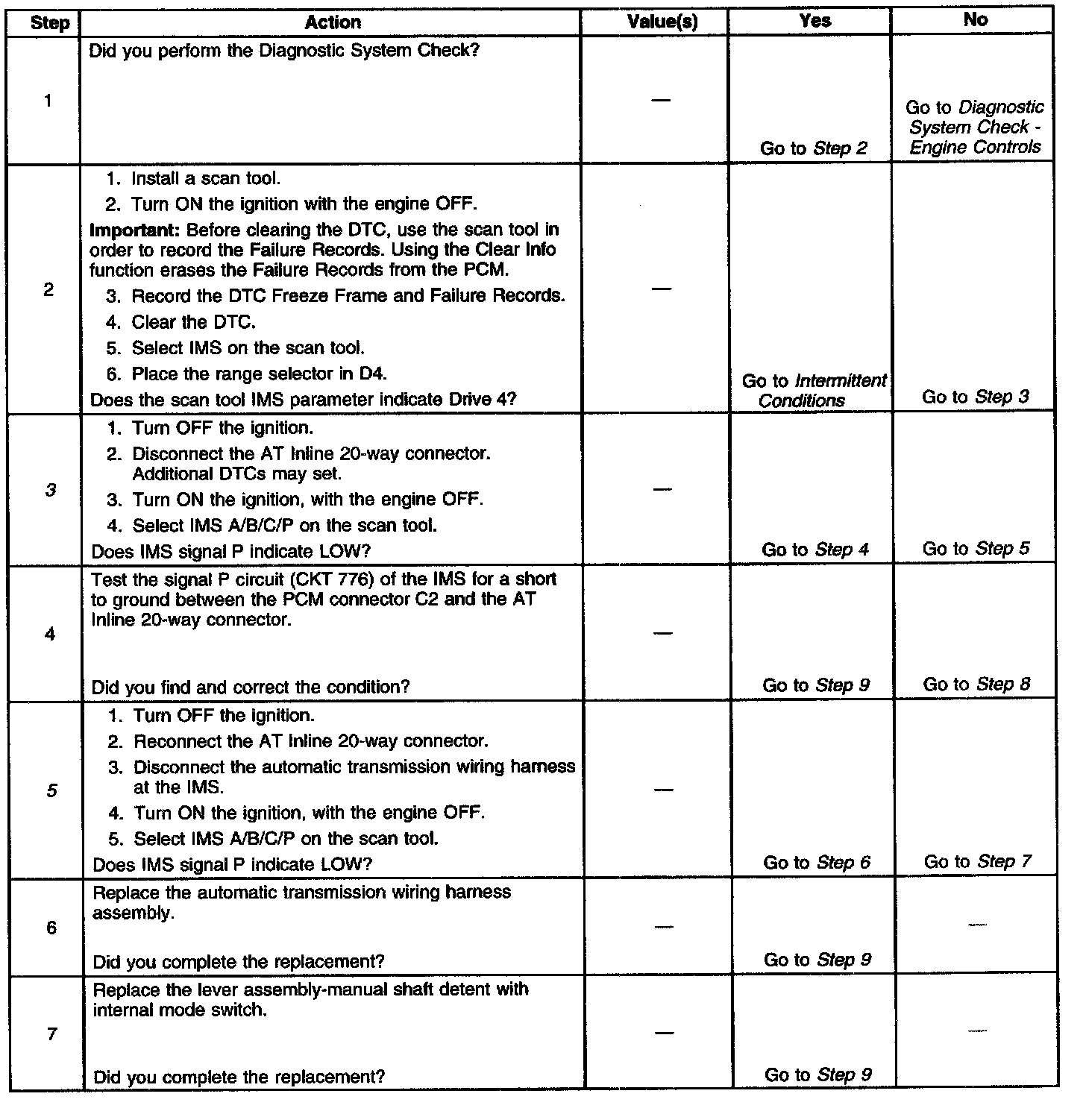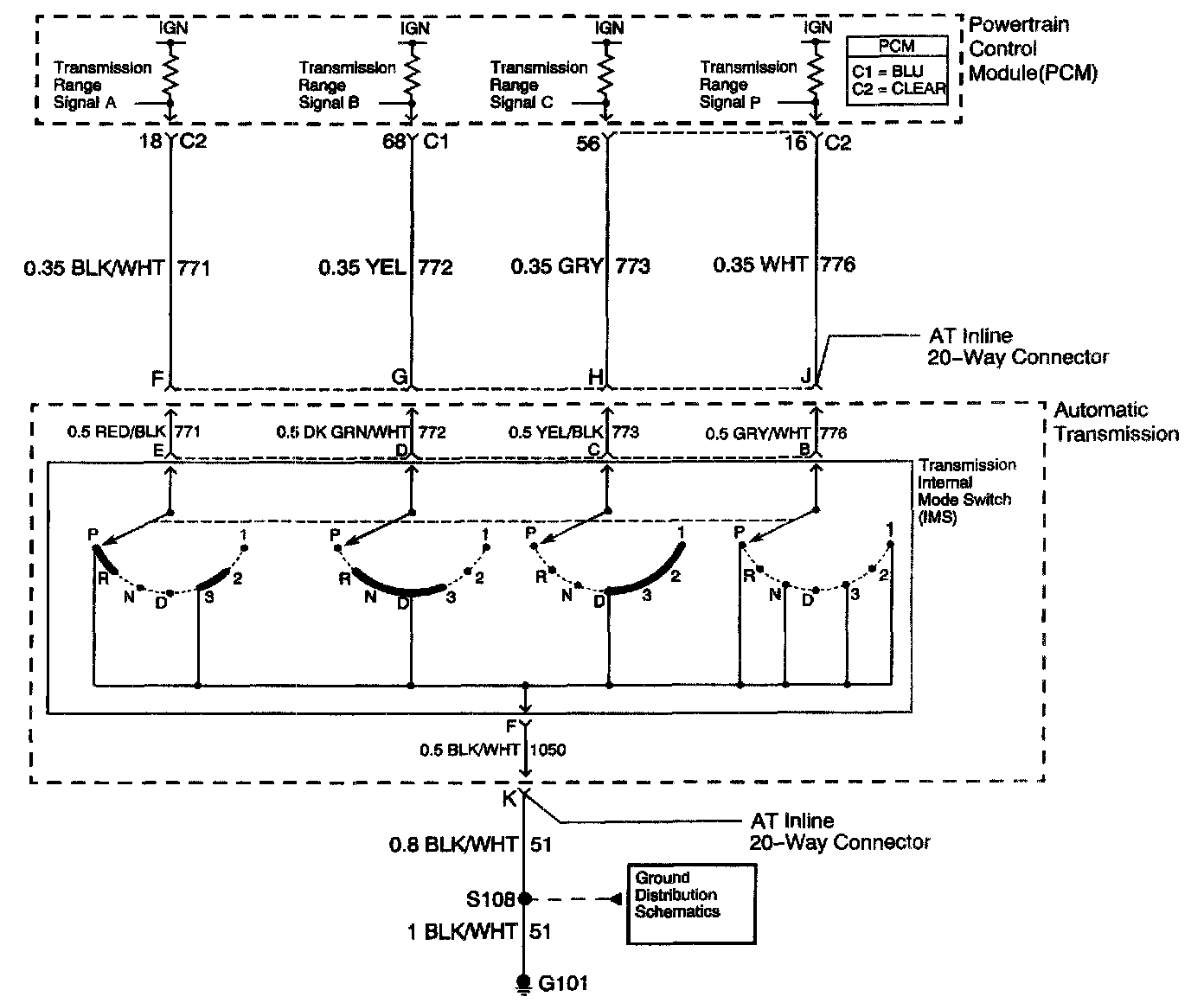 The transmission Internal Mode Switch (IMS) is a sliding contact switch attached to the selector detent inside the transmission side cover. The four inputs to the PCM indicate the position of the transmission range selector. The input voltage level at the PCM is high, B+, when the IMS is open and low when the switch is closed to ground. The four input parameters represented are Signals A, B, C and P - Parity.