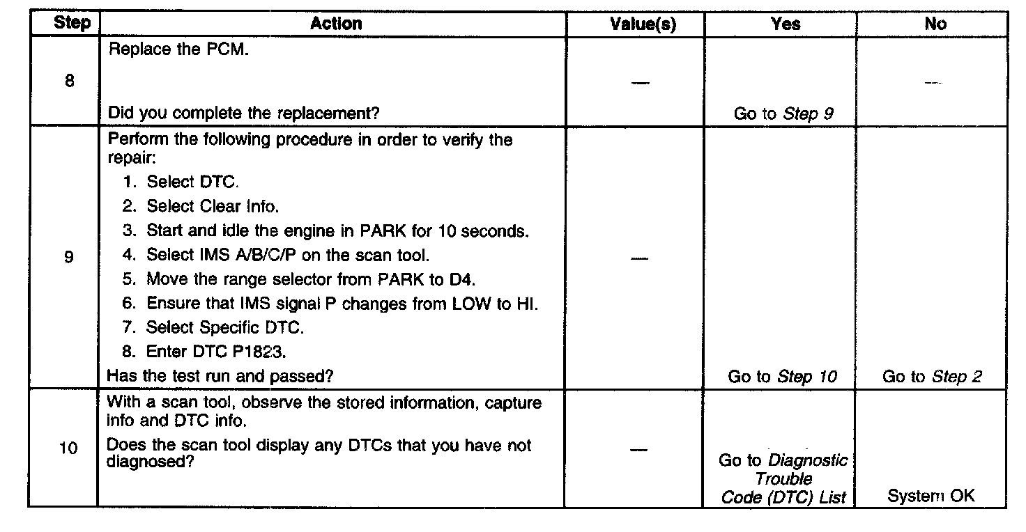 If the PCM detects that IMS Signal P is always low, then DTC P1823 sets. DTC P1823 is a type C DTC.