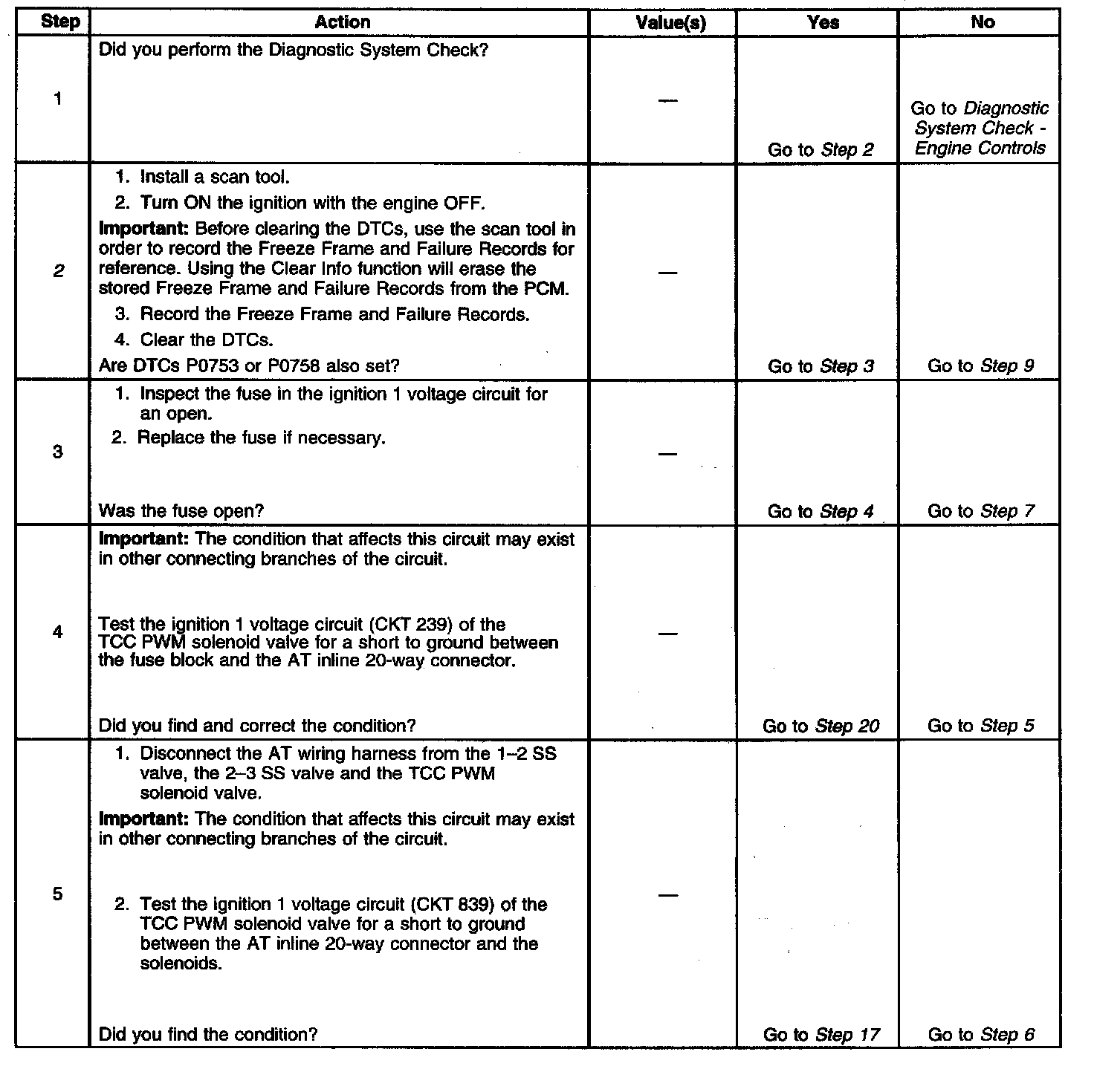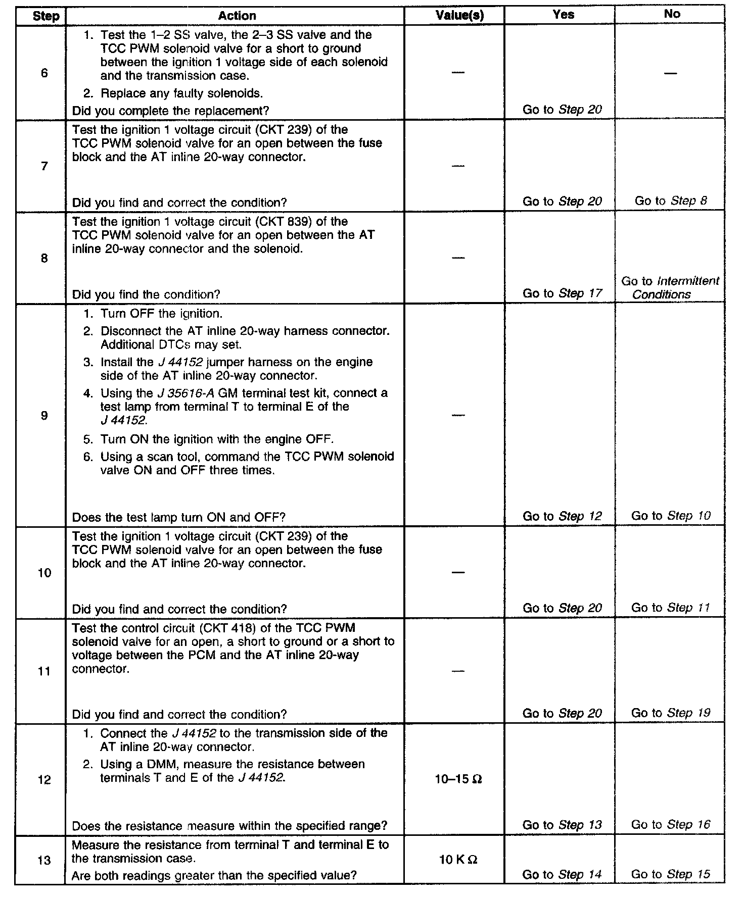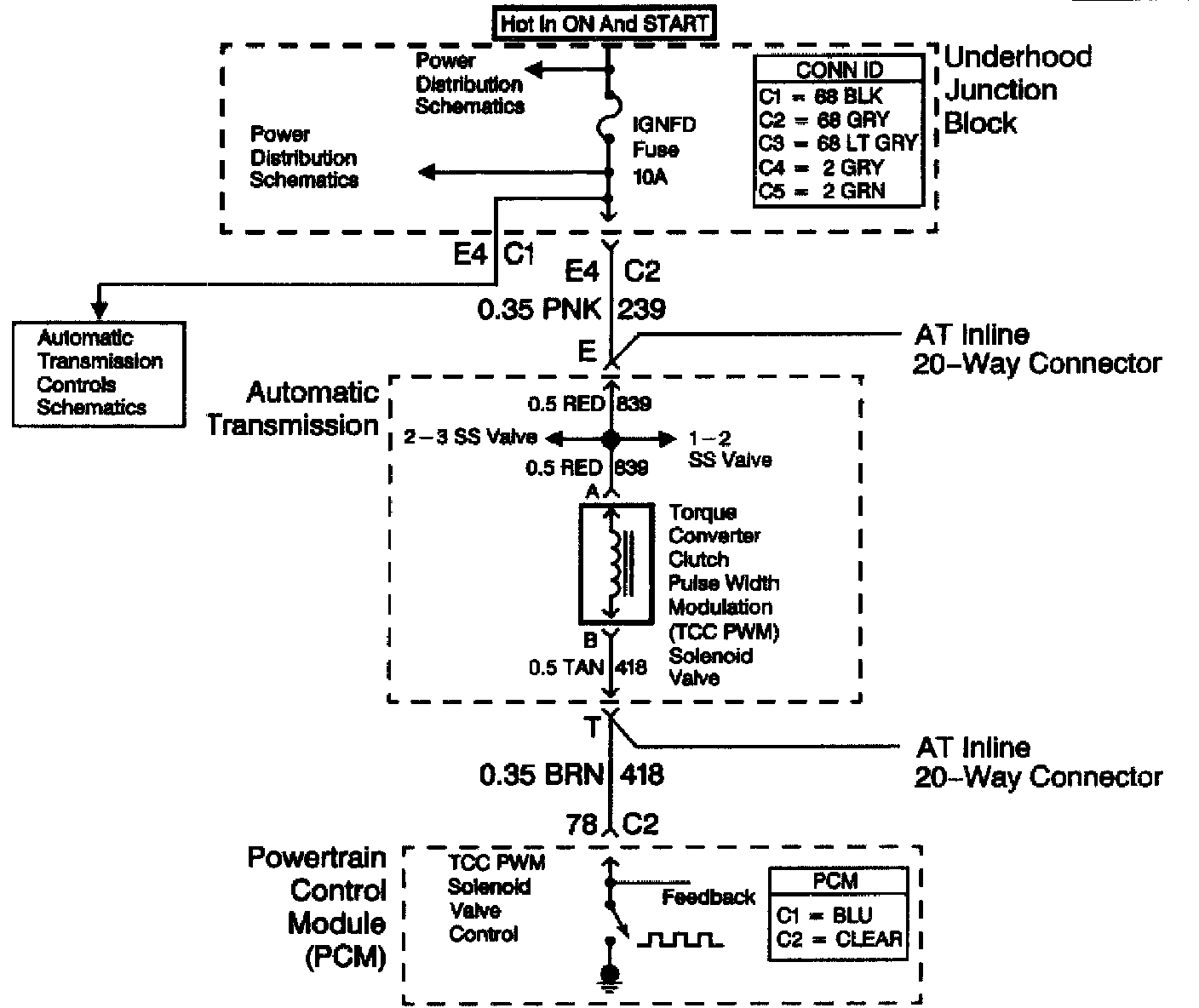 Ignition voltage is provided to the Torque Converter Clutch Pulse Width Modulation (TCC PWM) solenoid valve. The PCM controls the solenoid with a negative duty cycle in order to control application and release of the TCC. When the solenoid is commanded OFF, the PCM senses high voltage. When the solenoid is commanded ON, the PCM senses low voltage.