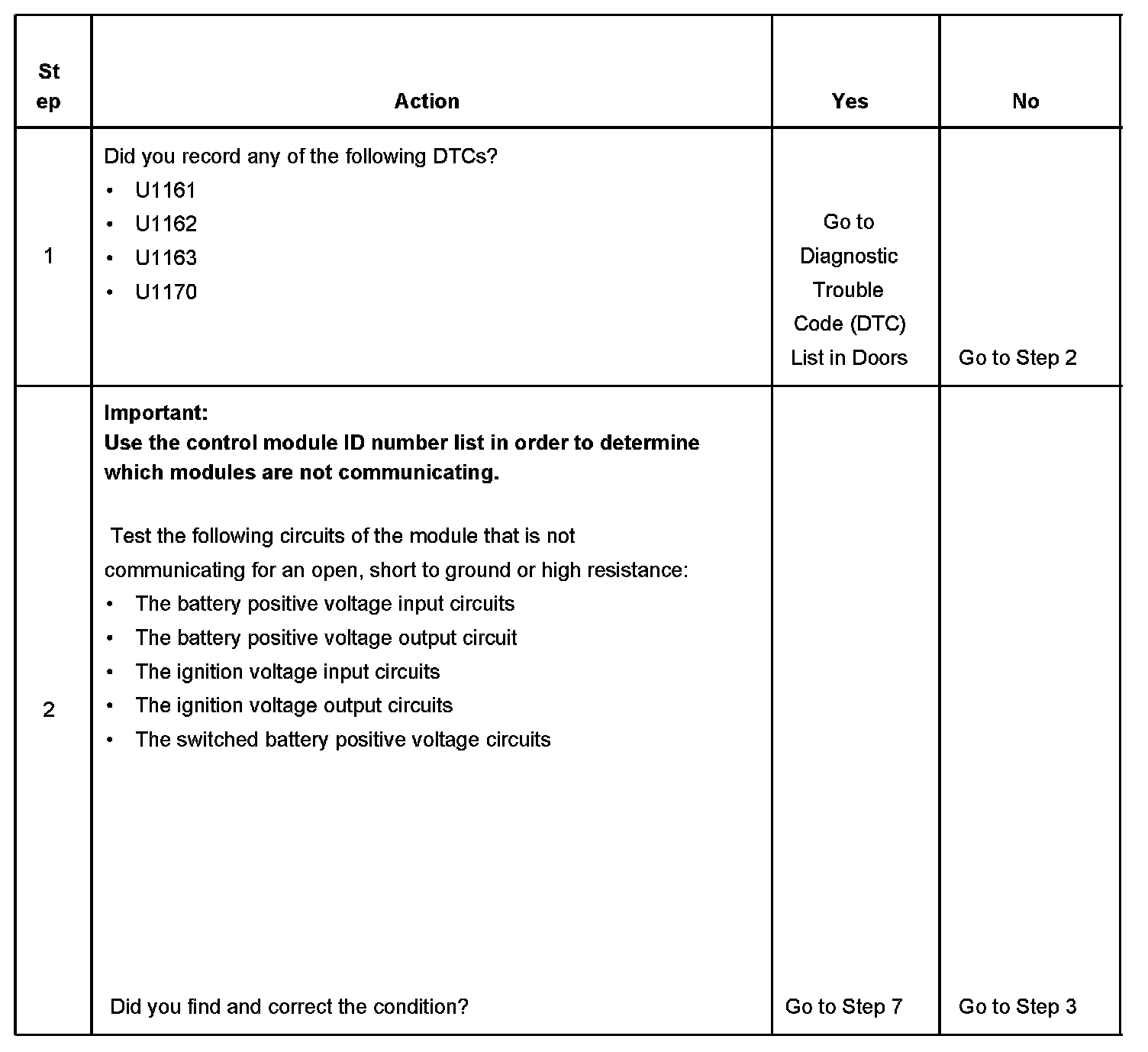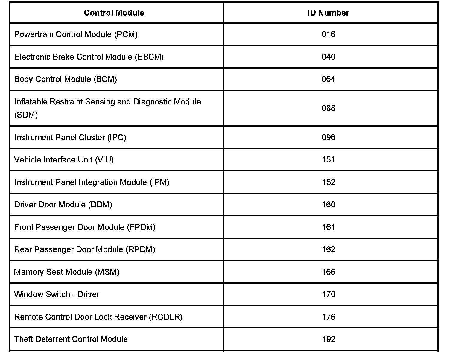 The control module ID number list provides a method for determining which module is not communicating. A module with a class 2 serial data circuit malfunction or which loses power during the current ignition cycle will have a Loss of Communication DTC set by other modules that depend on information from that failed module. The modules that can communicate will set a DTC indicating the module that can not communicate.