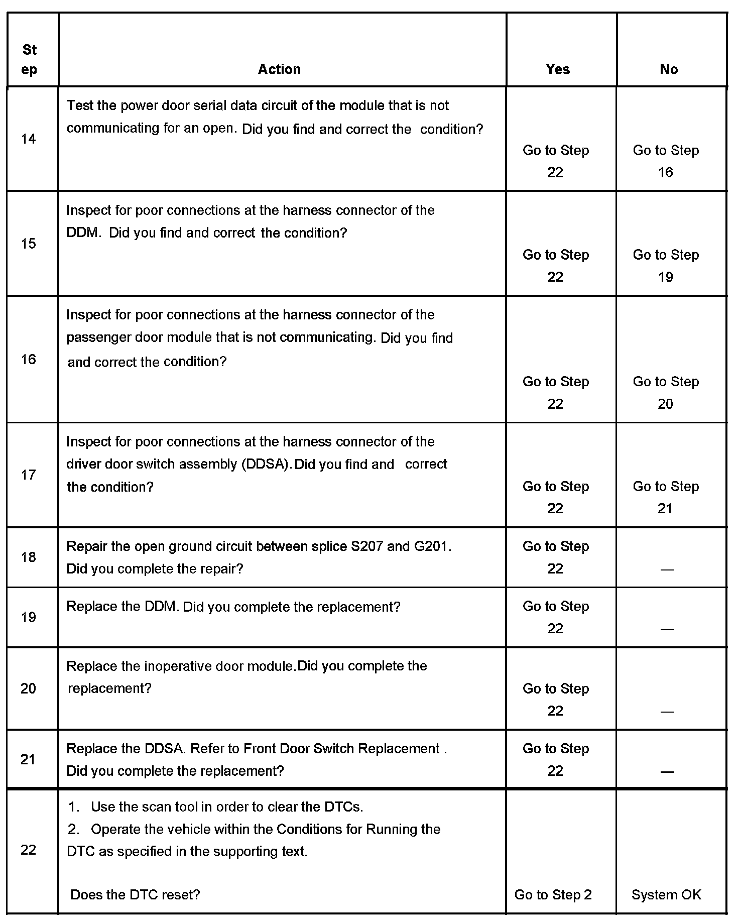 The power door serial data line provides a means for information exchange among the vehicle door modules. Door module information on inputs and commanded outputs are converted to power door serial data for exchange among the door modules. The DDM periodically addresses each module on the power door serial data line. When a module does not respond to the DDM, the DTC for that module is set.