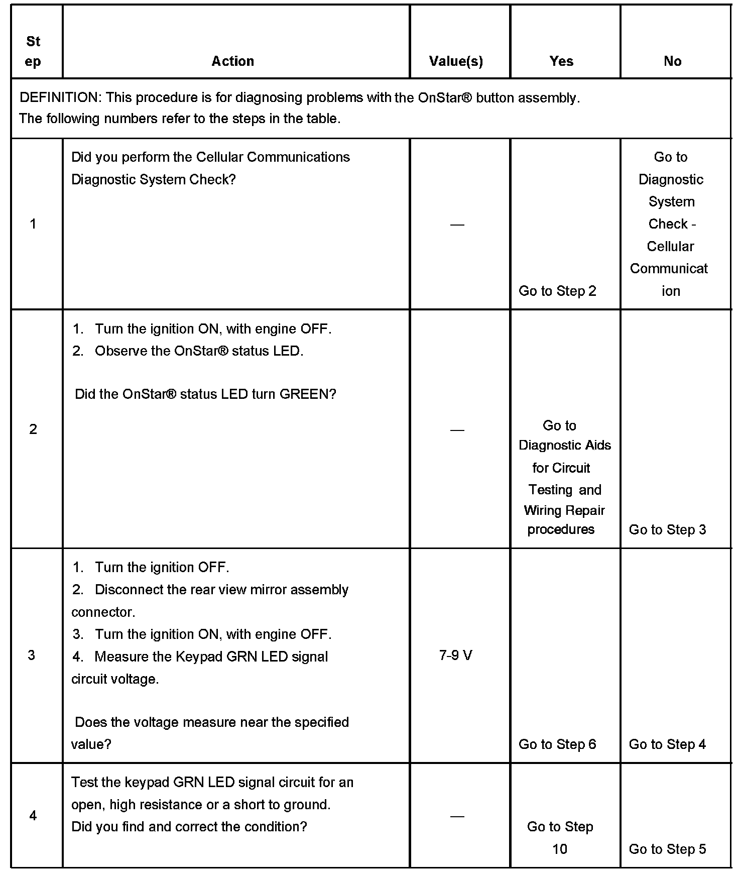5. If the GRN LED signal is shorted to voltage then the OnStar(R) three button assembly has been damaged. The OnStar(R) three button assembly has to be replaced.