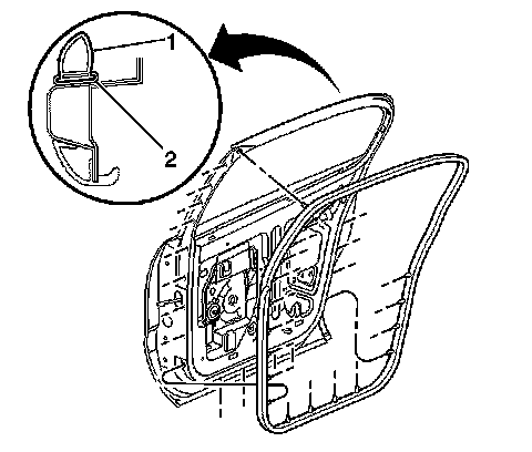 1. Install the push-in retainer (2) through the weatherstrip in the upper front corner of the door.