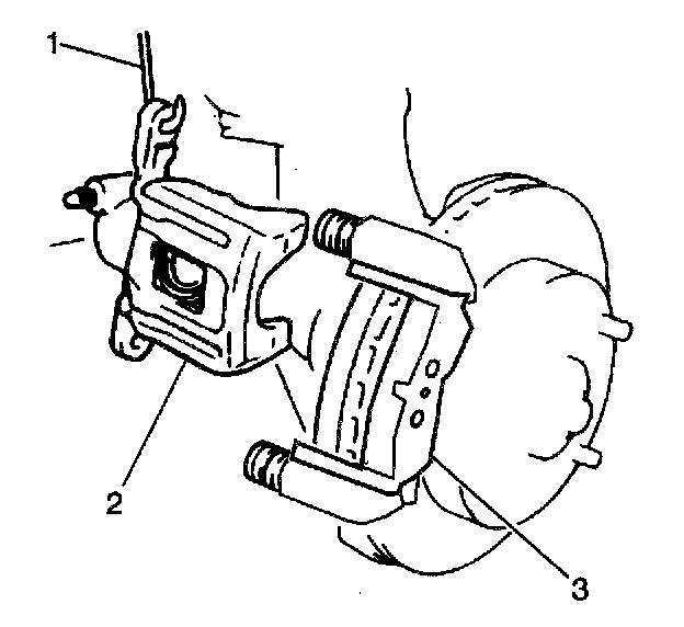 Notice: Support the brake caliper with heavy mechanic's wire, or equivalent, whenever it is separated from it's mount and the hydraulic flexible brake hose is still connected. Failure to support the caliper in this manner will cause the flexible brake hose to bear the weight of the caliper, which may cause damage to the brake hose and in turn may cause a brake fluid leak.