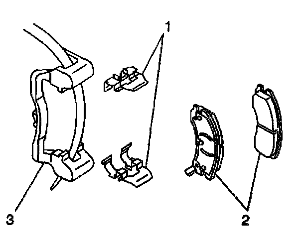 3. Remove the brake pad retainers (1) from the brake caliper bracket (3).