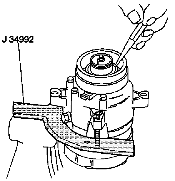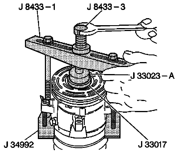 16. Tighten the J 8433-3 in the J 8433-1 in order to force the pulley rotor and bearing assembly onto the front head of the compressor.