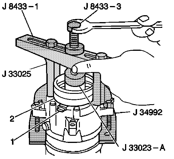 10. Tighten the J 8433-3 against the J 33023-A in order to remove the clutch coil (2).