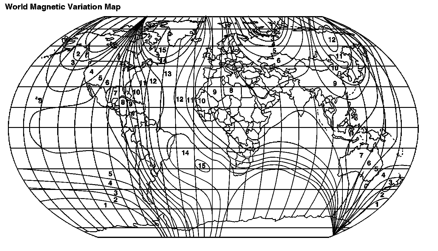 1. Locate your current geographic location on the World Magnetic Variation Map.