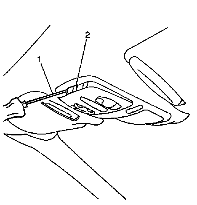 1. Insert a flat-bladed tool (1) at the rear edge of the access door in order to disengage the lock tab (2).