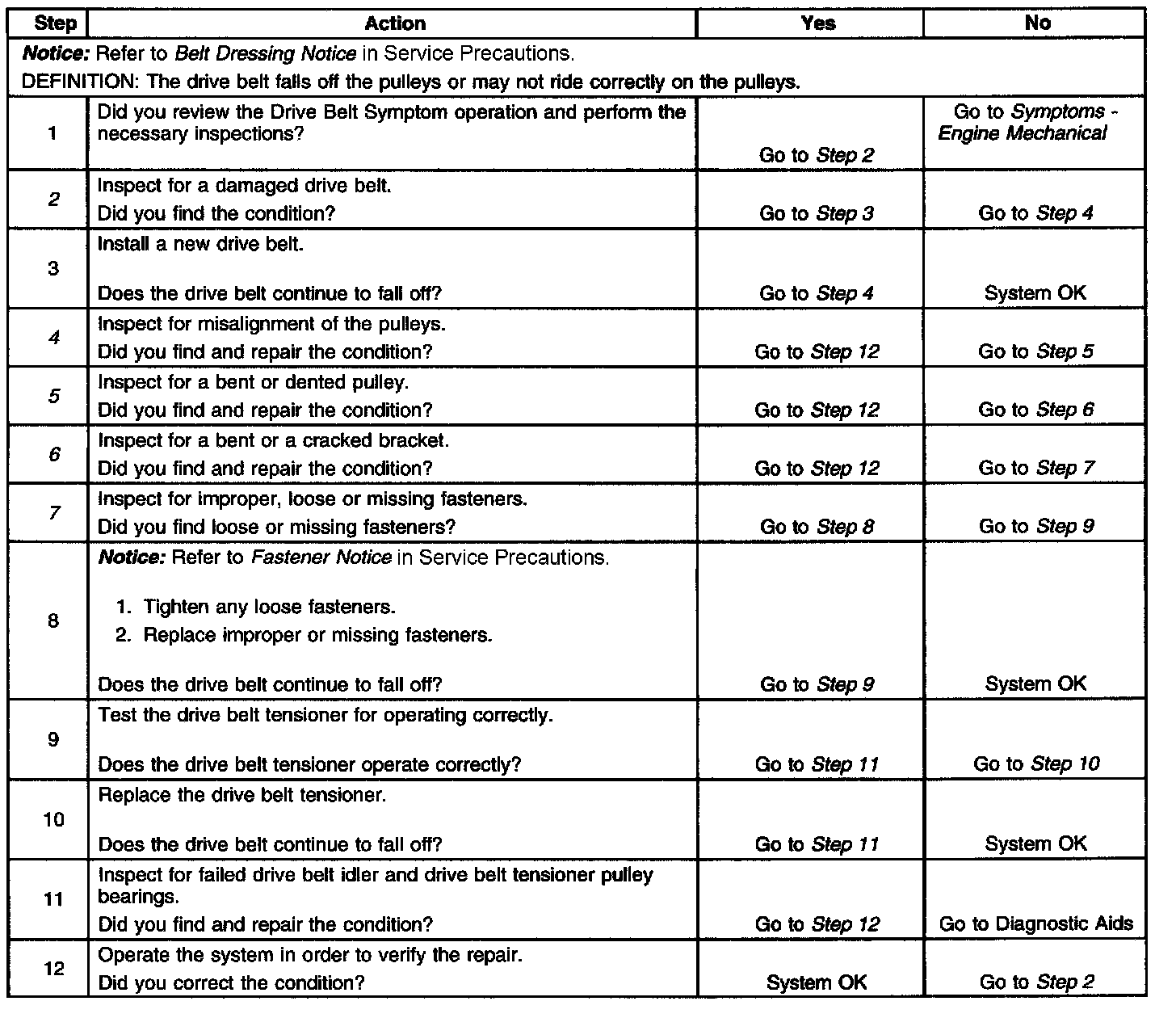 Drive Belt Falls Off DiagnosisSteps 1-12: