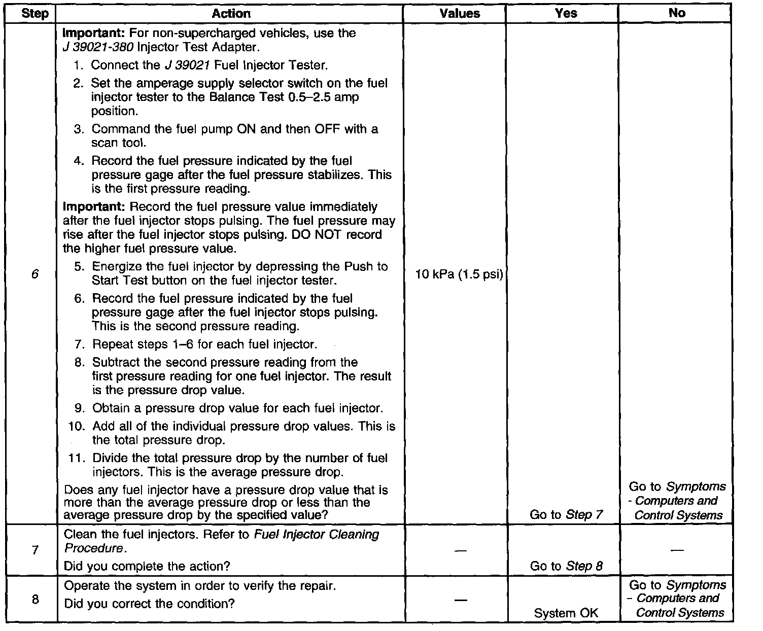 6. If the pressure drop value for each fuel injector is within 10 kPa (1.5 psi) of the average pressure drop value, the fuel injectors are flowing properly.