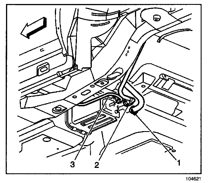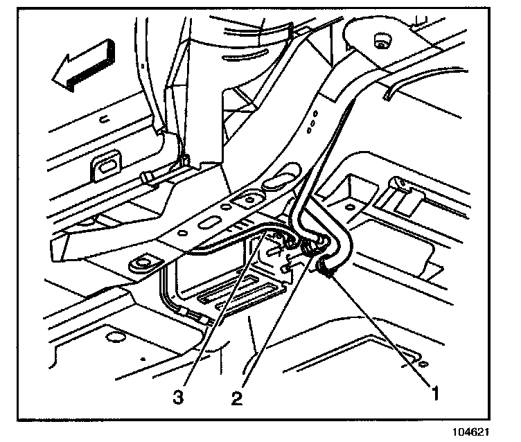 2. Disconnect evaporative emission (EVAP) purge pipe (3), vapor pipe (2) and vent hose/pipe (1) from the EVAP canister.