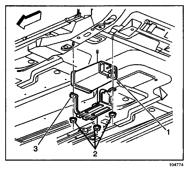 1. Install the EVAP canister (1) to the EVAP canister bracket (3) and position the canister on the underbody.