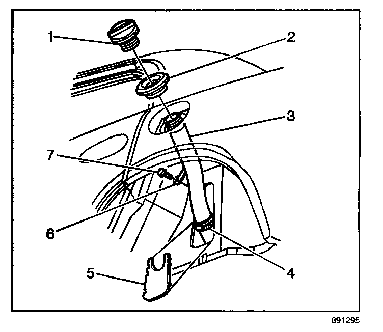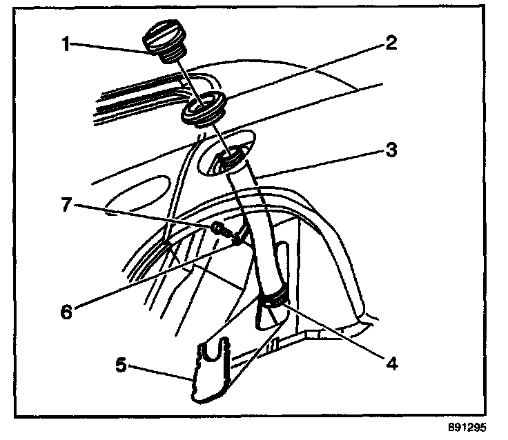 6. Remove the bolt (7) from the fuel filler tube ground wire (6).