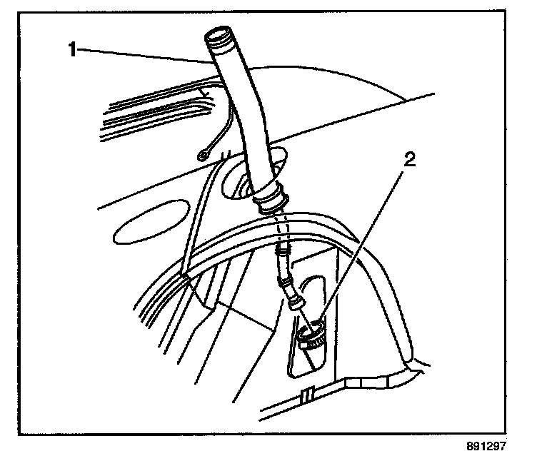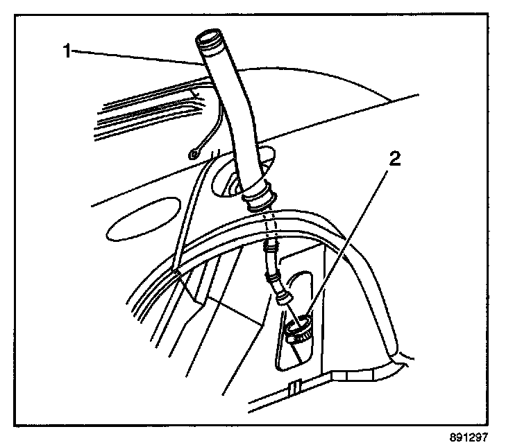 2. Install the fuel filler tube (1) into the fuel filler hose (2).