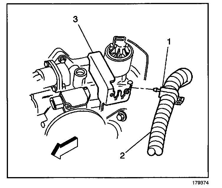 6. Remove the wiring harness clip (1) from bracket (3) if necessary (VIN K only).