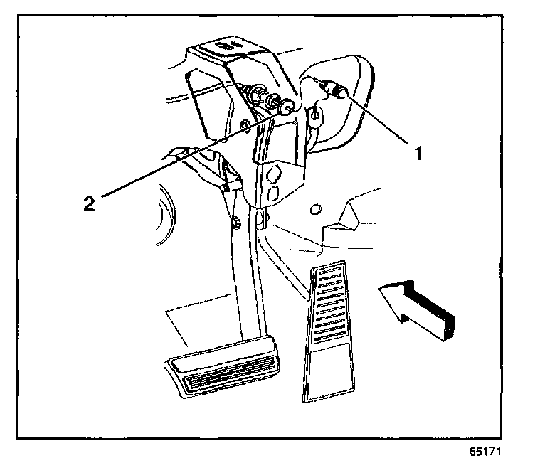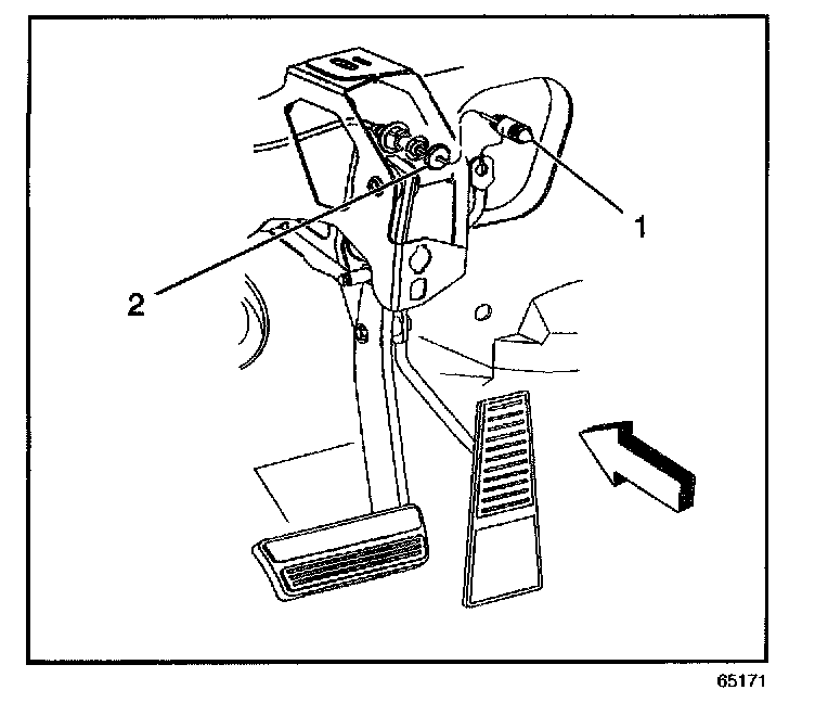 3. Install the accelerator control cable (1) through the slot in the accelerator pedal lever (2).