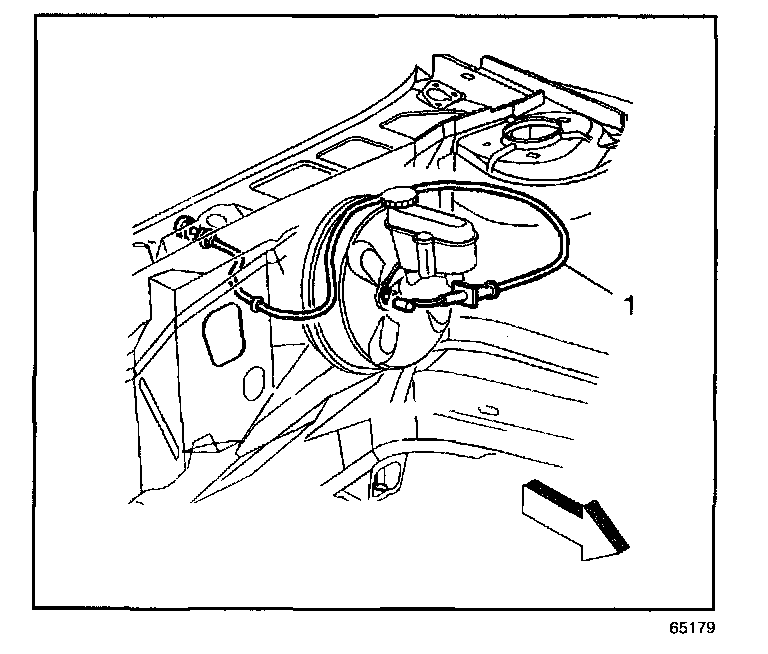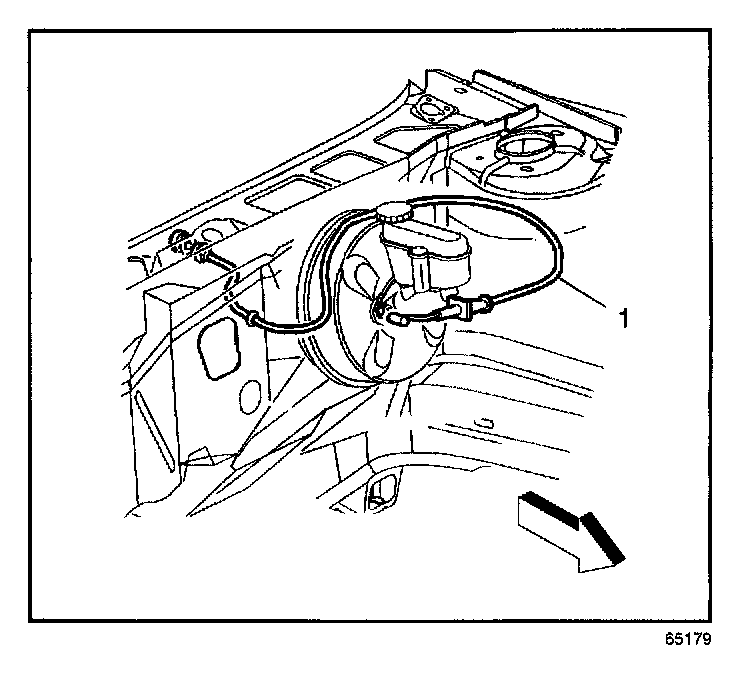 3. Squeeze the accelerator cable cover tangs and push the accelerator cable (1) through the bulkhead.