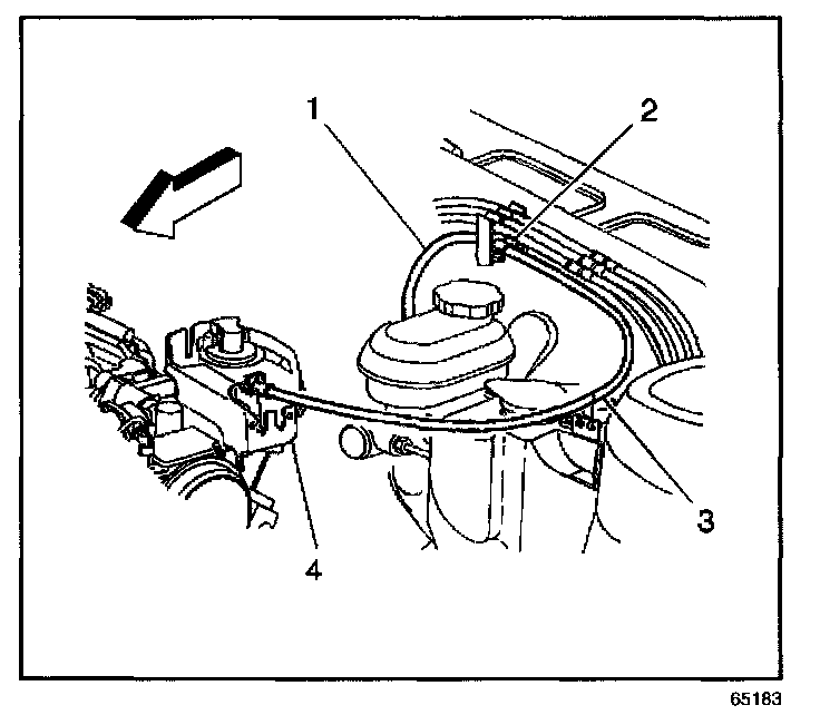 5. Remove the accelerator control cable (1) from the right slot on top of washer bottle (3).