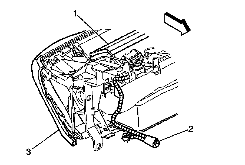 4. Route the wiring harness (2) to the inflatable restraint I/P module in place in order to secure the yellow connector clip to the I/P (3).