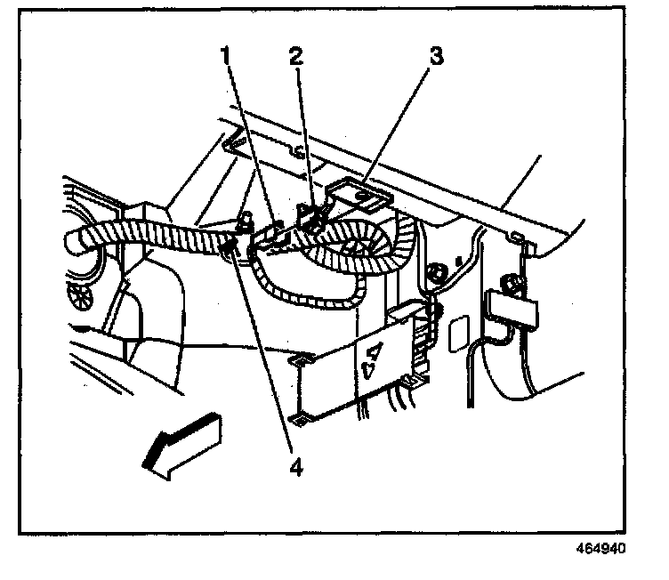 1. Route the inflatable restraint I/P module pigtail (4) down through the I/P (1).