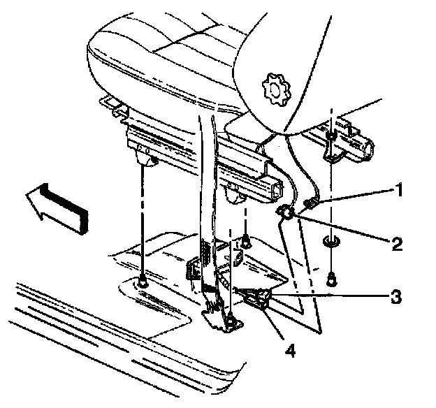 44. Disconnect the passenger side impact module yellow connector (1) from the vehicle wiring harness (4) located under the passenger seat.