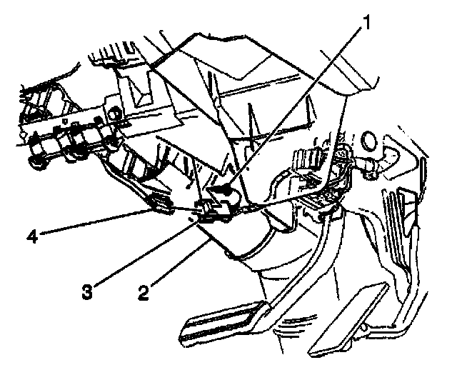 19. Disconnect the driver side impact module yellow connector (1) from the vehicle wiring harness (4) located under the driver seat.