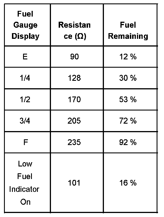 The values in the table are approximate values based on information obtained from properly operating vehicles. Actual results may vary slightly.