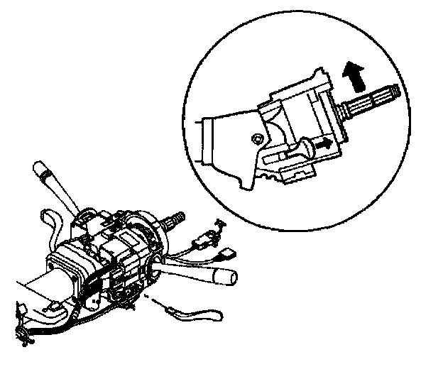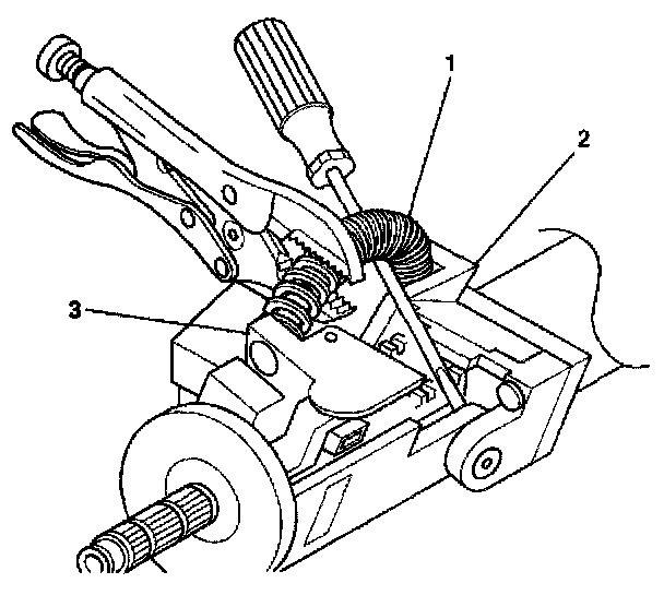5. Remove the tilt spring (1) from the steering column support assembly (2) and from the steering column tilt head assembly (3) by using the following procedure: