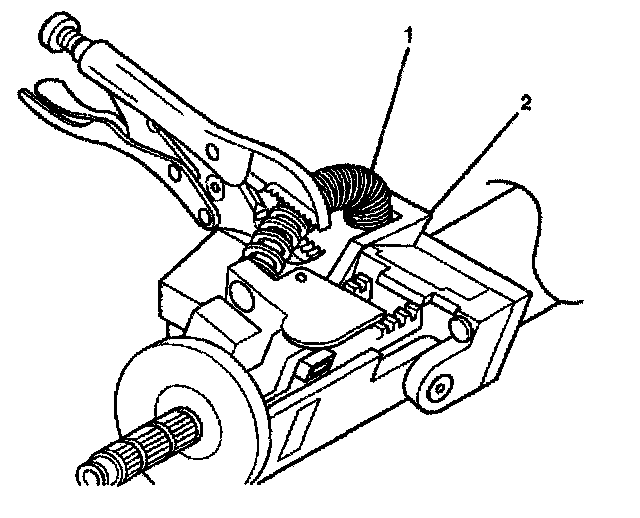 3. Install the tilt spring (1) onto the steering column support assembly (2) and onto the steering column tilt head assembly by using the following procedure: