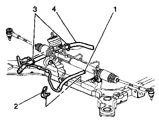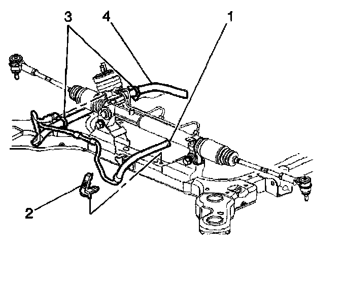 10. Remove the power steering gear pressure and return hoses (1, 4) from the power steering gear.