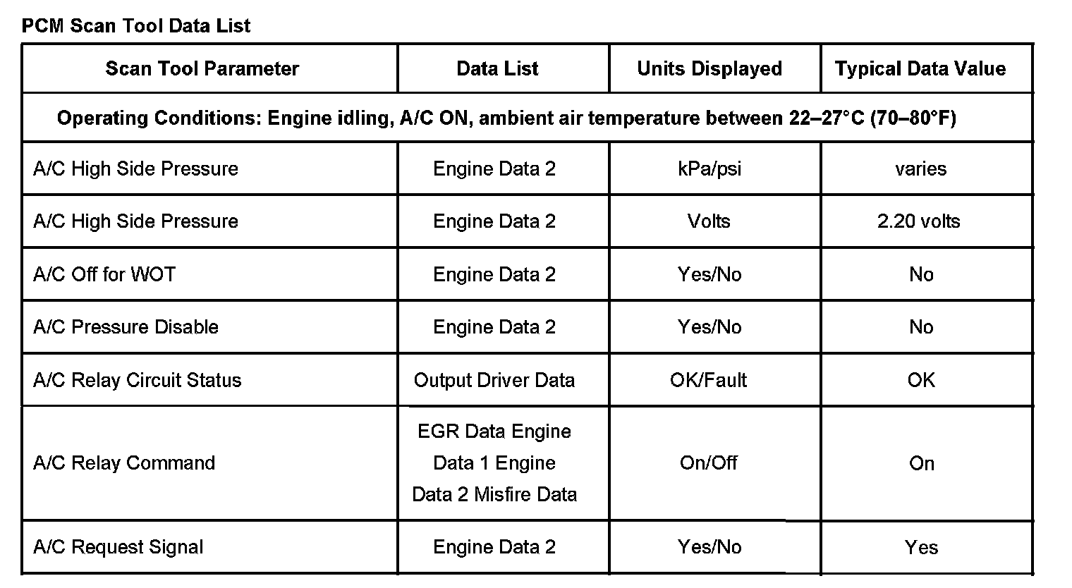 The scan tool data values were taken from a known good vehicle under the following conditions:
