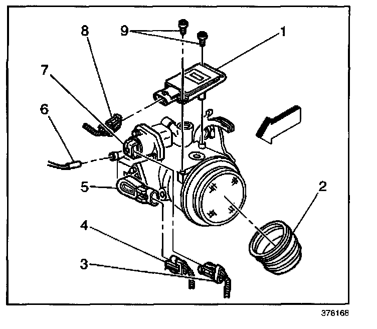 4. Remove the screws (9) that hold the MAF sensor to the throttle body.