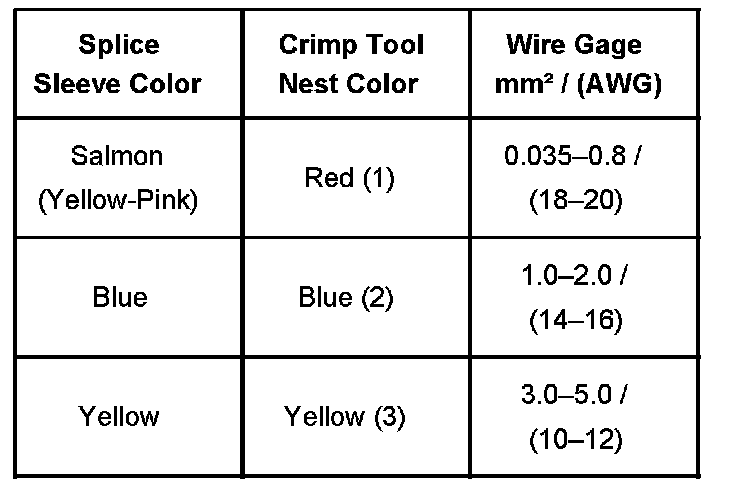 4. Select the proper sealed splice sleeve according to the wire size. Refer to the table at the beginning of the repair procedure for the color coding of the splice sleeves and the crimp tool nests.