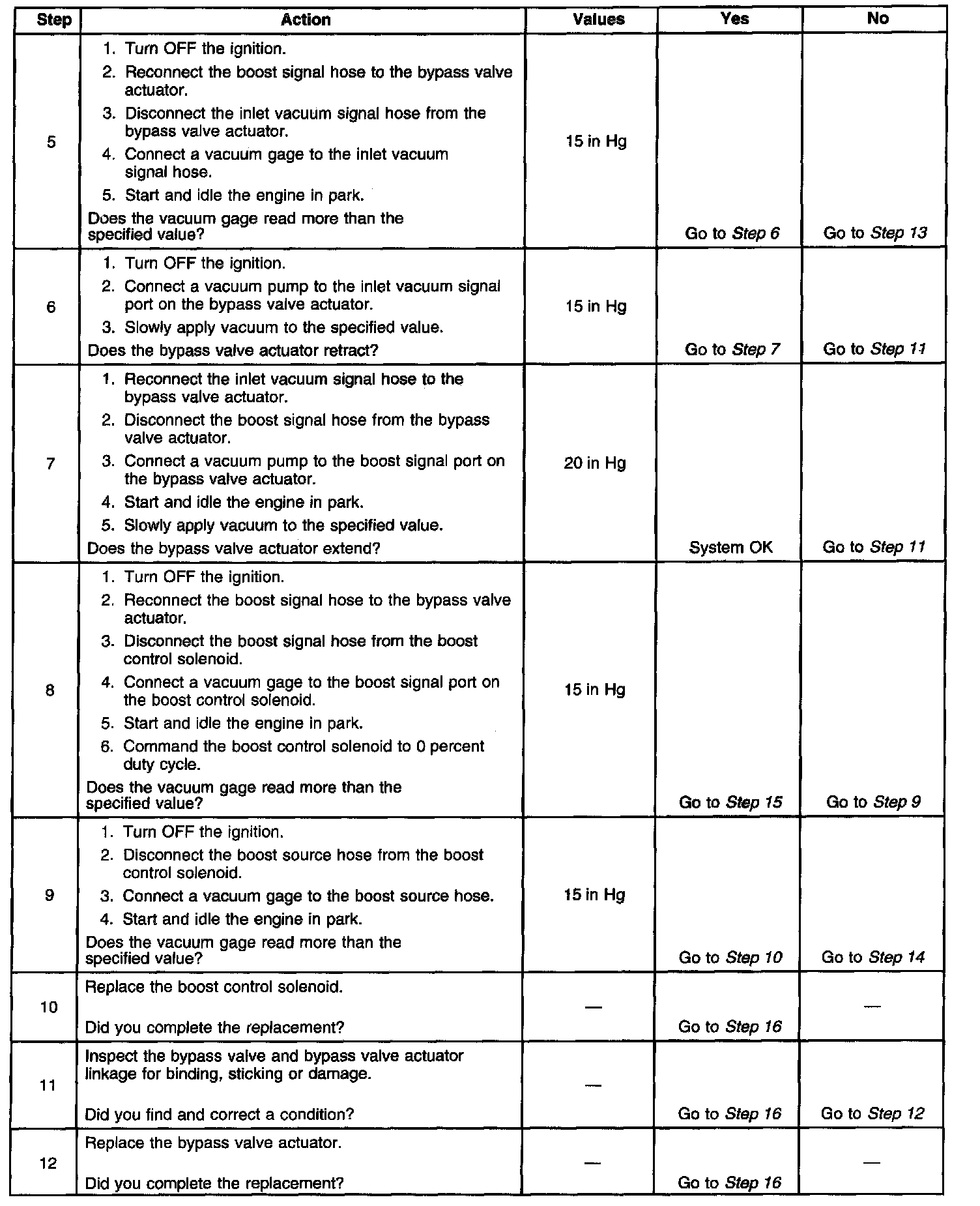 The PCM controls boost pressure by using the boost control solenoid. The boost control solenoid is a normally open valve. Under most conditions, the PCM commands the boost control solenoid to operate at a 100% duty cycle. This keeps the solenoid valve closed and allows only inlet vacuum to control the position of the bypass valve. At idle, engine vacuum is applied to the upper side of the bypass valve actuator, counteracting spring tension to hold the bypass open. As engine load is increased, engine vacuum is decreased, causing the spring in the bypass valve actuator to overcome the applied vacuum, closing the bypass valve and allowing the boost pressure to increase. When reduced boost pressure is desired, the PCM commands the boost control solenoid to operate at a 0 percent duty cycle. This opens the solenoid valve and allows boost pressure to enter the bypass valve actuator at the lower side to counteract the spring tension, opening the bypass valve and recirculating excess boost pressure back into the supercharger inlet.