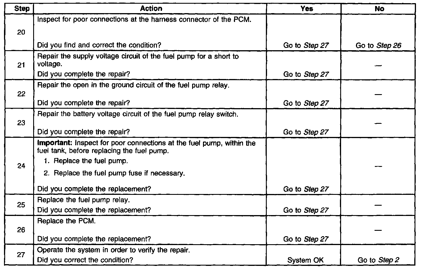16. This step tests the fuel pump supply circuit between the fuel pump and the fuel pump relay for an open or high resistance.