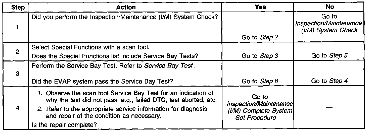 The purpose of this test is to satisfy the enable criteria necessary to execute inspection/maintenance (I/M) readiness diagnostics for the evaporative emission (EVAP) system. The test may be used to set the I/M System Status indicators to YES. The I/M System Status display on the scan tool indicates whether or not the control module has completed the required test. The required test is complete when either all of the DTCs comprising the test have run and passed, or when any one of the DTCs comprising the test has illuminated the malfunction indicator lamp (MIL). Once the test is complete, the I/M System Status display will indicate YES in the completed column. Performing a visual inspection prior to running the EVAP test may prevent having to repeat the test due to the fact that a failed or aborted test will require the vehicle to cool down in order to meet the enable criteria to run another test.