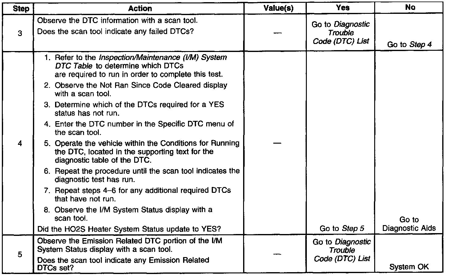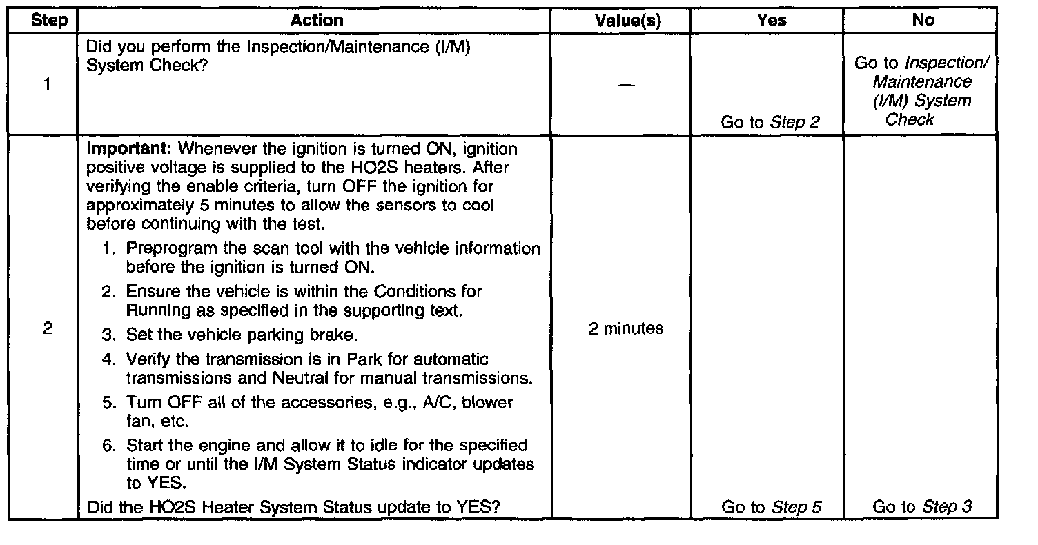 The purpose of this test is to satisfy the enable criteria necessary to execute inspection/maintenance (I/M) readiness diagnostics for the heated oxygen sensor (HO2S) system. The test may be used to set the I/M System Status to YES. The I/M System Status display on the scan tool provides an indication of whether the control module has completed the required tests. The I/M System Status does not indicate that the tests have passed or failed. When all of the diagnostics for a specific system have run and passed, the I/M System Status will update to YES. If a test for a specific system has failed, the I/M System Status will update to YES, indicating a determination was made, even if all of the other tests for that system have not run.