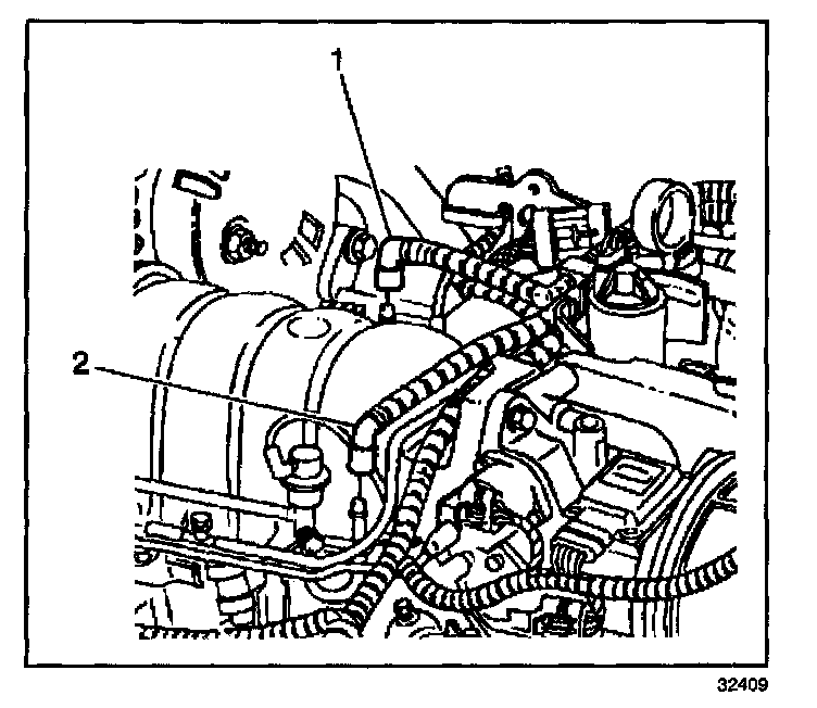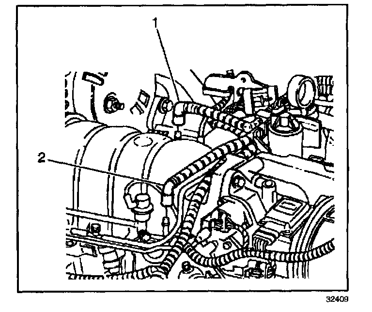3. Disconnect the fuel feed, (1) and return pipes (2) from the fuel rail tubes.