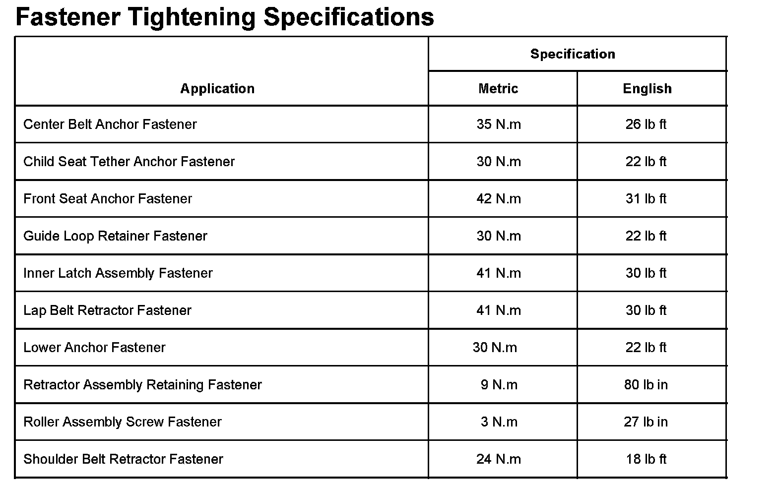 Fastener Tightening Specifications: