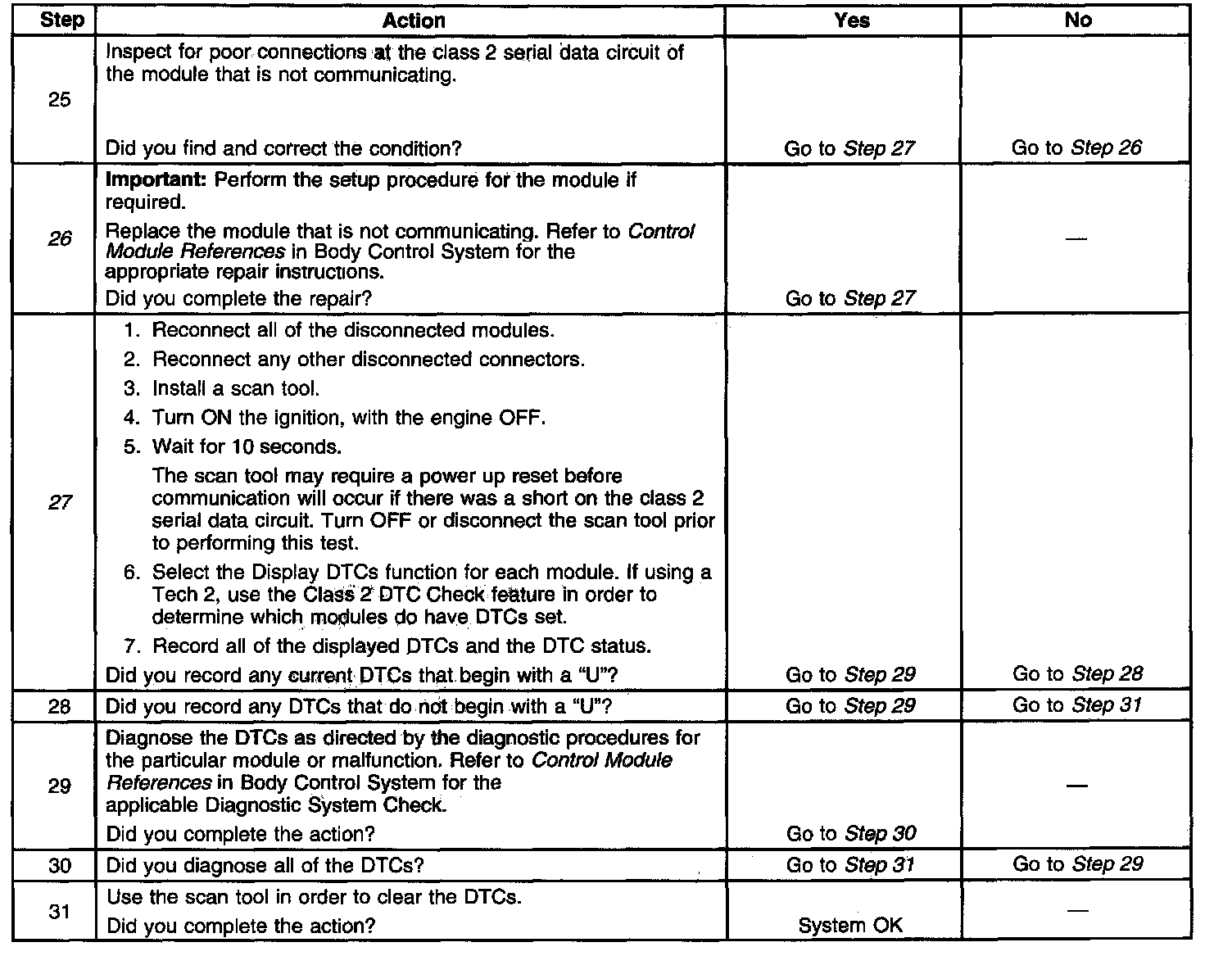2. A partial malfunction in the class 2 serial data circuit uses a different procedure from a total malfunction of the class 2 serial data circuit. The following modules communicate on the class 2 serial data circuit: