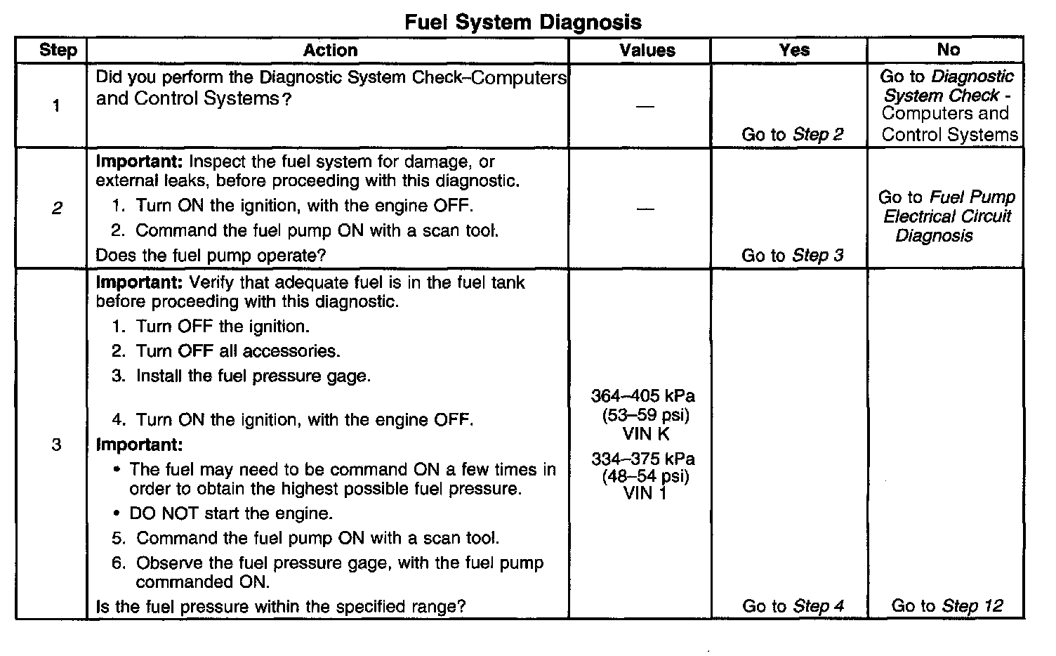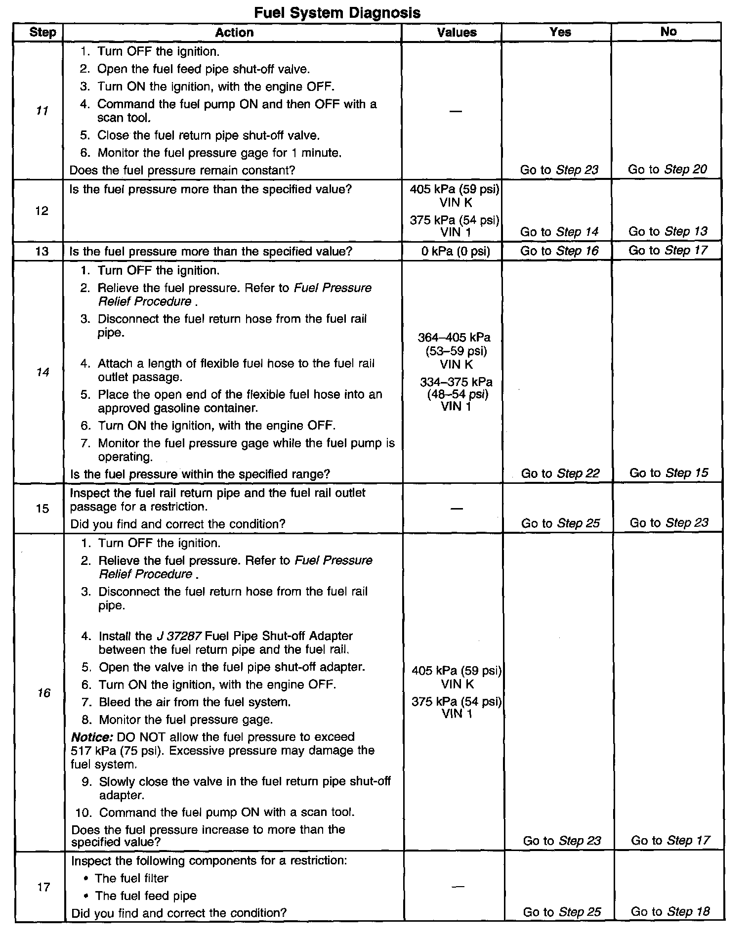 14. This step tests for a restricted fuel return pipe. If the fuel pressure is within the specified values, a restriction in the fuel return pipe is indicated.