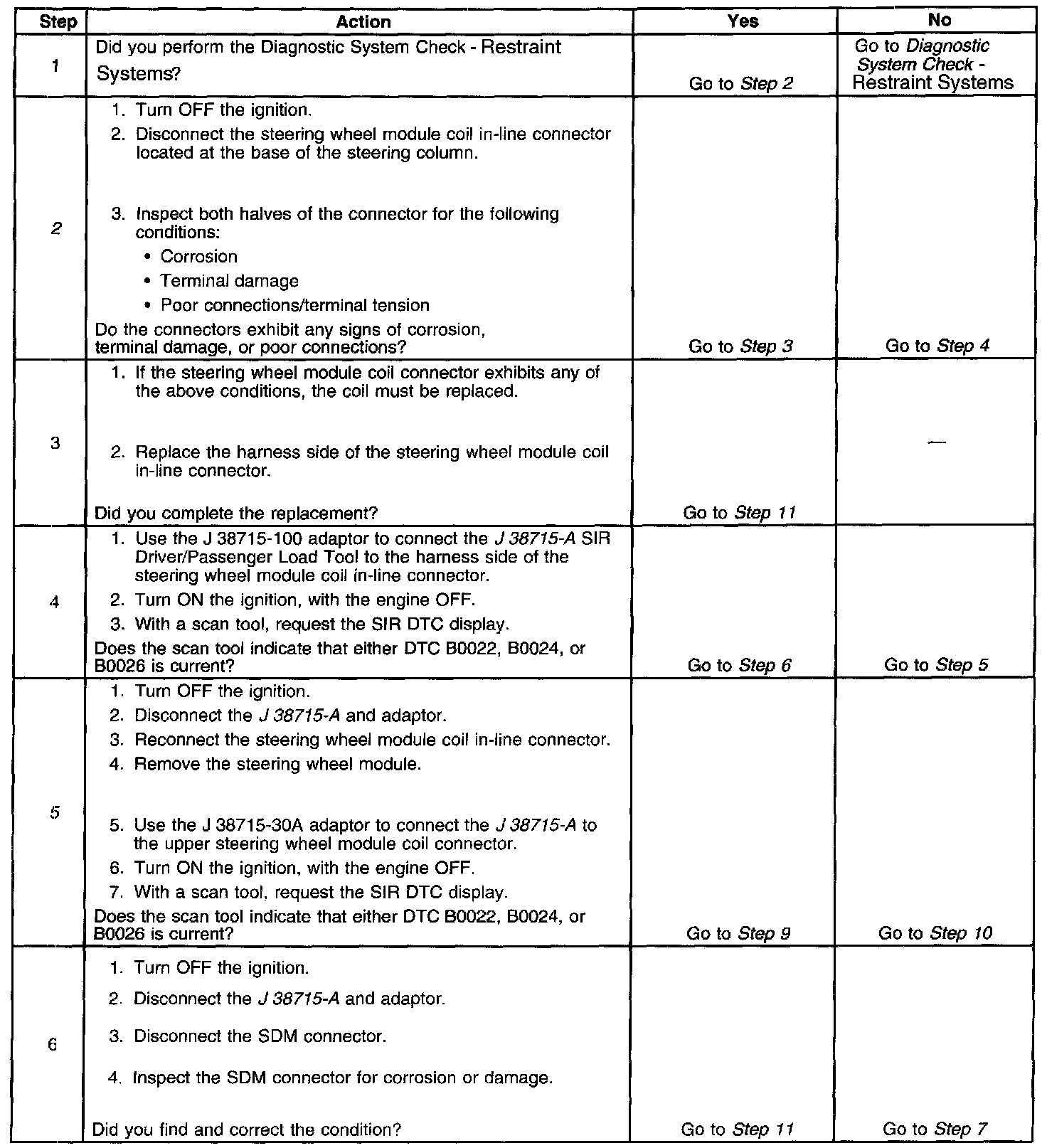 The inflatable restraint steering wheel module deployment loop consists of a steering wheel module, steering wheel module coil, steering wheel module high signal circuit, and steering wheel module low signal circuit. Shorting bars are used on the steering wheel module connector as well as the steering wheel module coil connector which will short together the steering wheel module high and steering wheel module low signal circuits when the connector is disconnected. This will help to prevent unwanted deployment of the inflator module during servicing. When the ignition is turned ON, the inflatable restraint sensing and diagnostic module (SDM) performs continuous diagnostic tests on the deployment loops to check for proper circuit continuity and for shorts to ground or voltage. If a malfunction is detected, a DTC will be stored.