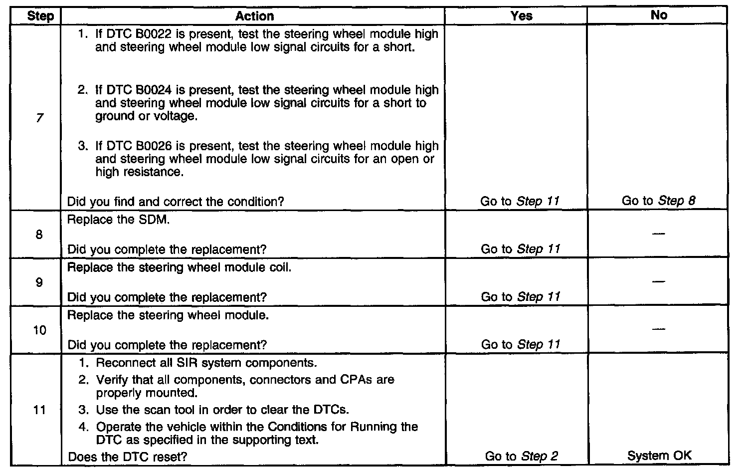 7. If DTC B0022 is present, test for a short between the steering wheel module high and steering wheel module low signal circuits. If DTC B0024 is present, test for a short to ground or voltage in the steering wheel module high and steering wheel module low signal circuits. If DTC B0026 is present, test for an open or high resistance in the steering wheel module high and steering wheel module low signal circuits.