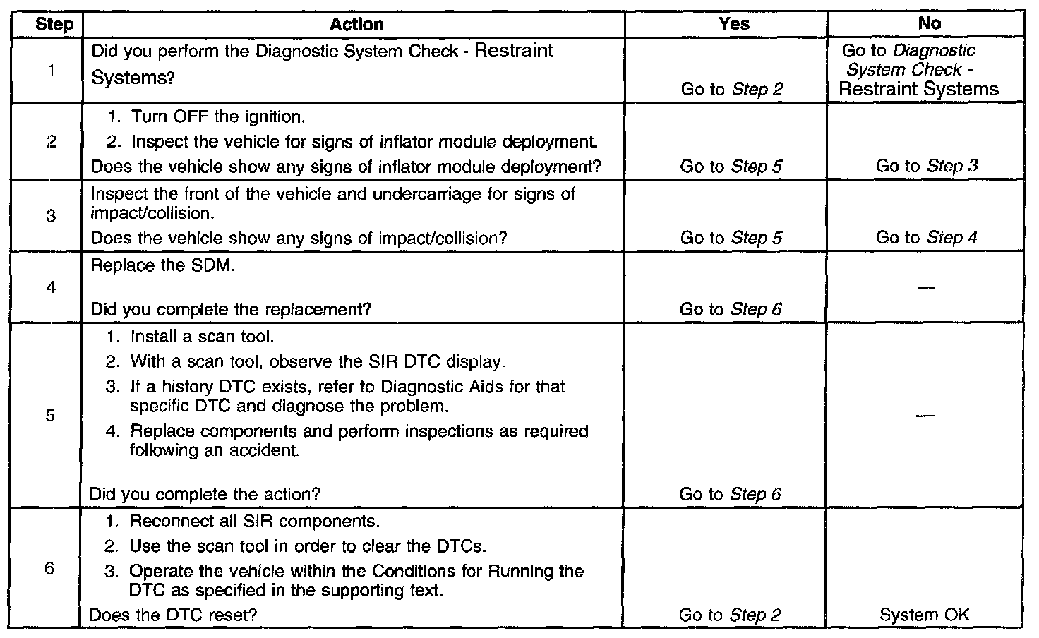 The inflatable restraint sensing and diagnostic module (SDM) contains sensing devices that convert vehicle velocity changes to electrical signals. The SDM processes the generated electrical signals and compares them to values stored in memory. When the generated signals exceed the stored values, the SDM performs additional signal processing and compares the generated signals to signals stored in memory. When 2 of the generated signals exceed the stored values, the SDM will cause current to flow through the inflator modules deploying the inflator modules. Diagnostic trouble code (DTC) B0053 will set along with DTC B0051 when a deployment occurs while a circuit malfunction is present in any one of the deployment loops.