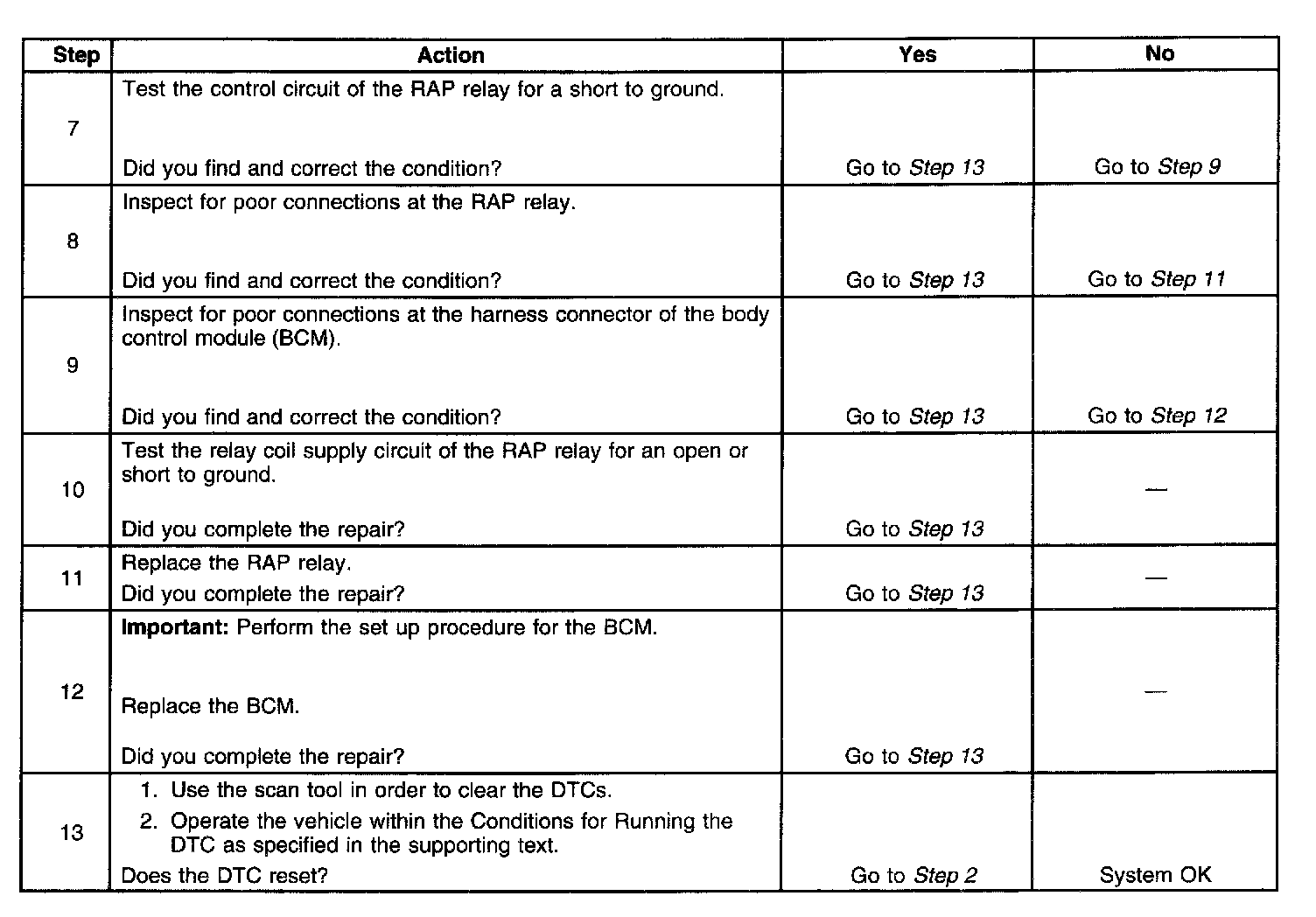 - The correct voltage is present at the RAP relay control circuit as detected by the BCM.
