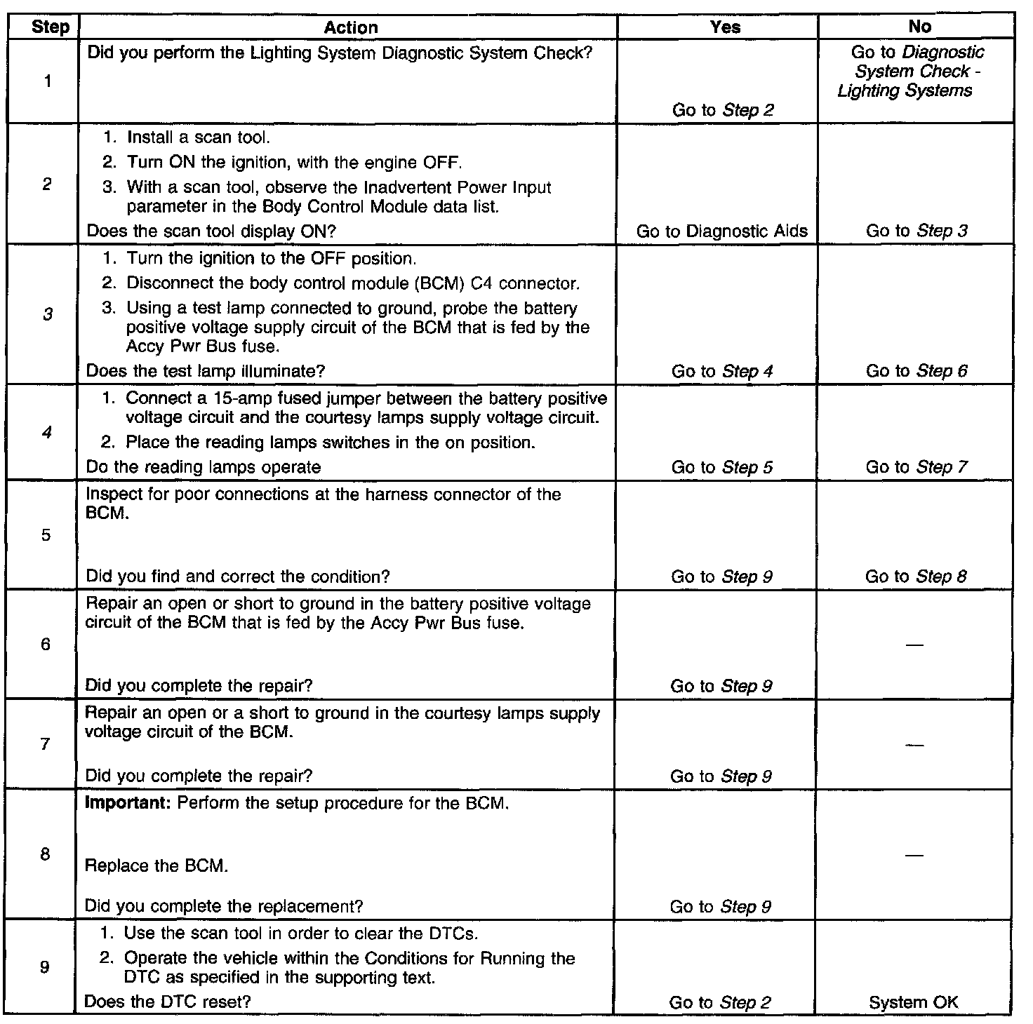 - The fault code sets when the BCM commanded state does not match the feedback. When the courtesy lamps supply voltage circuit is commanded high and a short to ground is present.