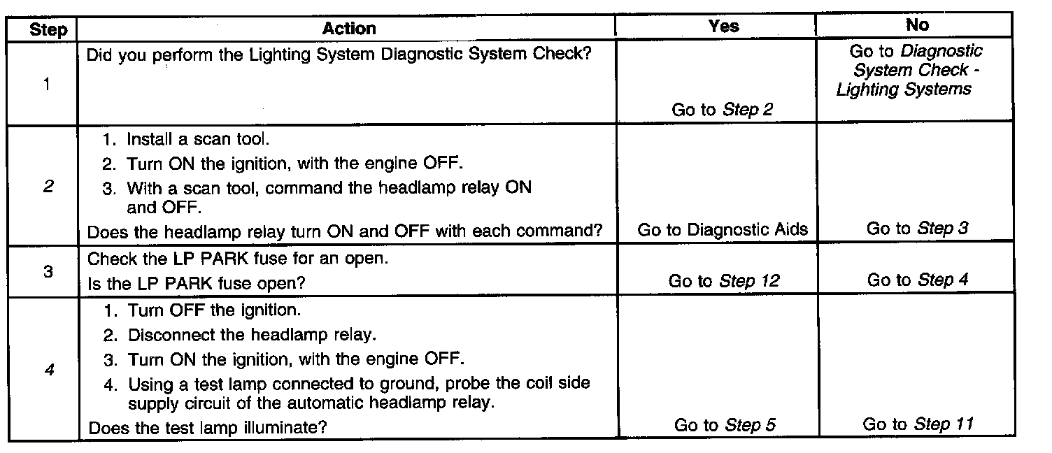 4. Tests for voltage at the coil side feed of the automatic headlamp relay. The LP Park fuse supplies power to the coil side feed of the automatic headlamp relay.